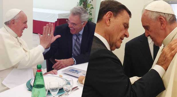 Is that a couple of Pentecostals explaining to the Pope the priesthood ended at the cross and that they never knew Christ or is he being congratulated for keeping the Jews and Muslims from finding Jesus?